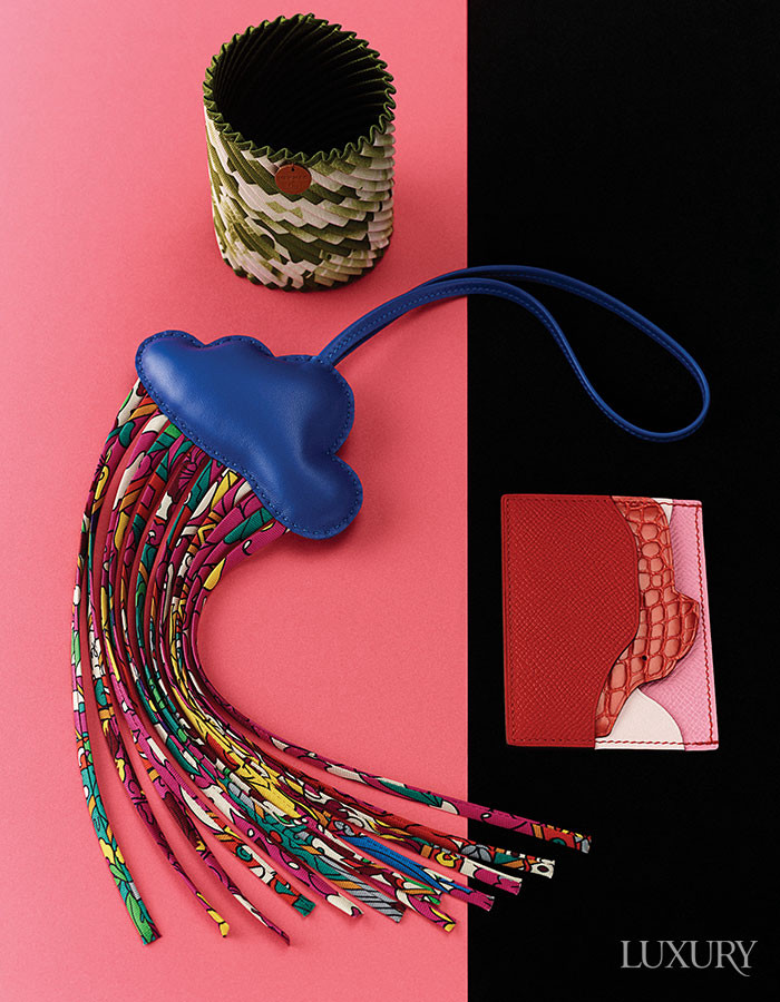 플리츠 기법으로 제작한 실크 뱅글과 실크·램스킨 소재의 구름 모티프 백 참, 코끼리 모티프가 돋보이는 카드 홀더 모두 에르메스.