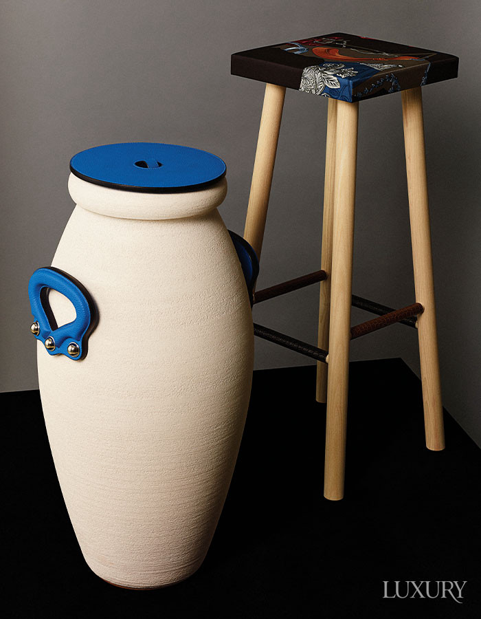 테라코타, 로즈 우드, 불카프스킨을 조합한 항아리와 실크·앨리게이터로 가죽으로 장식한 애시 우드 스툴 모두 에르메스.