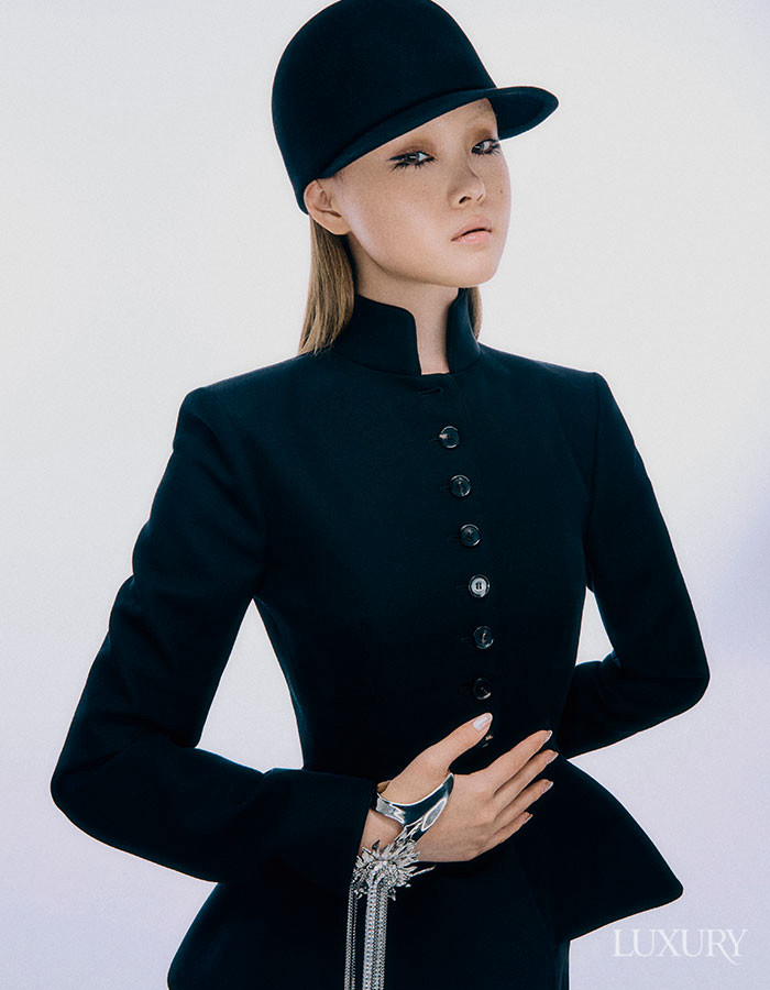 승마에서 영감받은 모자와 페플럼 디테일의 재킷 모두 로로피아나. 크리스털 체인 드롭 장식의 핸드 주얼리는 맥퀸.