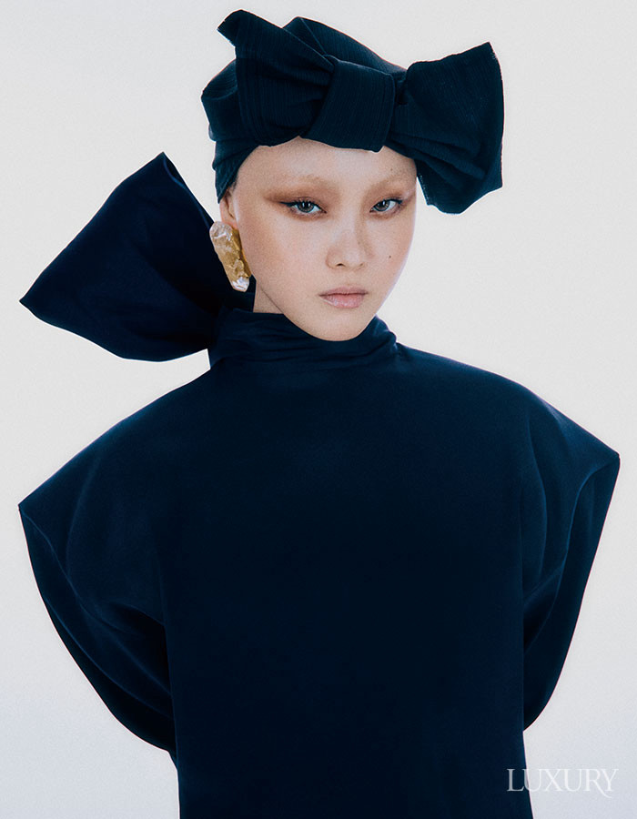 리본 장식 터번은 브라운햇. 라발리에르 장식의 오버사이즈 숄더 톱과 원석 장식 골드 이어링 모두 생 로랑 by 안토니 바카렐로.