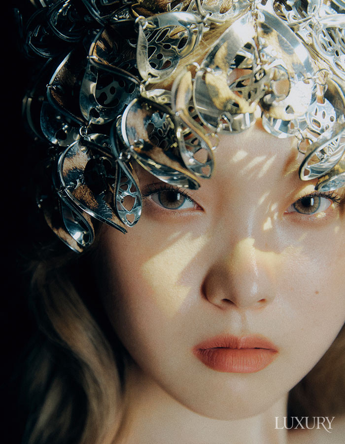 레이저 커팅한 작은 피스들을 엮어 만든 헤드피스는 유에치치YUEQI QI.