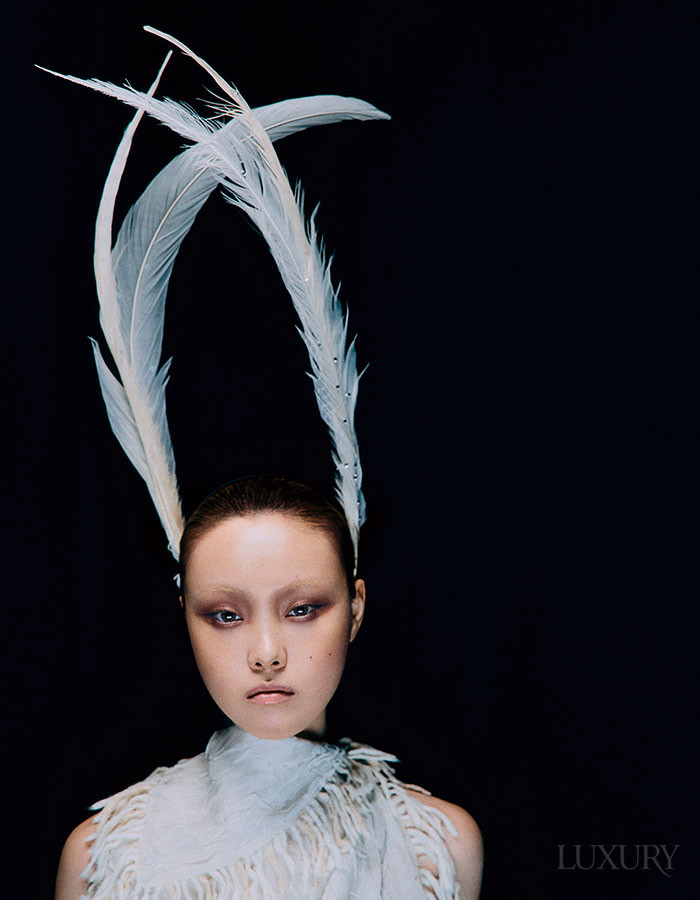 긴 깃털 장식의 헤드피스는 큐 밀리너리. 프린지 장식 드레이프 톱은 크리스토퍼 에스버 by 아데쿠베.