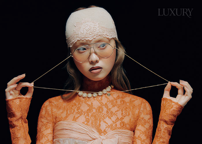 캐시미어와 레이스 소재의 헤드밴드는 발렌티노 가라바니. 플로럴 레이스 보디슈트와 시폰 소재 튜브톱 드레스 모두 발렌티노. 안경줄이 포함된 에비에이터 셰이프의 안경은 구찌. 크리스털 장식의 골드 네크리스는 파나쉬 차선영.