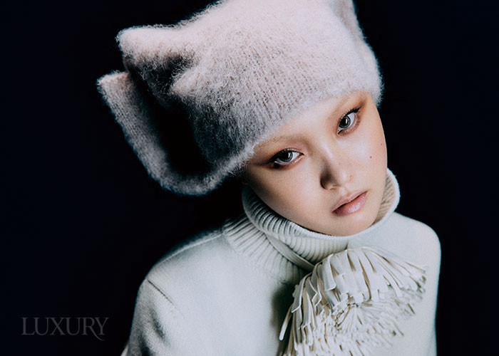 모헤어 소재의 모자는 로로피아나. 하이넥 니트 톱과 레더 플라워 초커는 알라이아.
