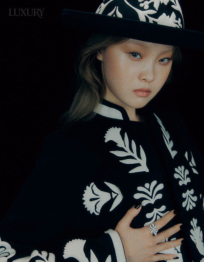 목가적인 자수를 더한 브림 햇과 재킷 모두 로로피아나. 큐빅 장식의 리본 모티프 링은 타니 바이 미네타니.