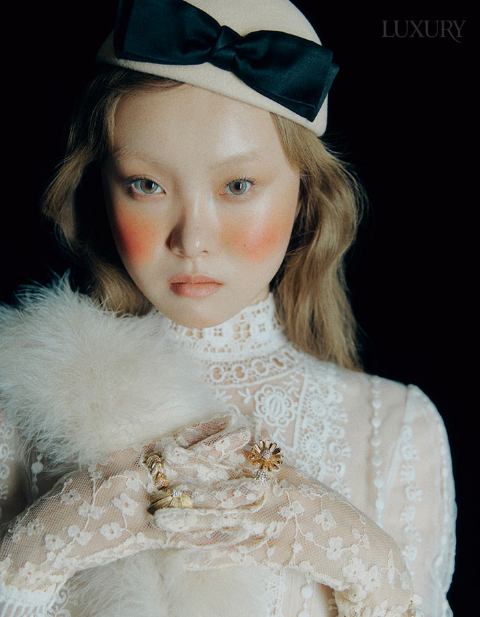 레이스 드레스는 발렌티노. 새틴 리본 장식의 베레모와 레이스 장갑, 칠면조 깃털 소재 스톨 모두 발렌티노 가라바니. 오른손에 착용한 골드 링 모두 타니 바이 미네타니. 왼손에 착용한 데이지 모티프 더블 핑거 링은 로저 비비에.