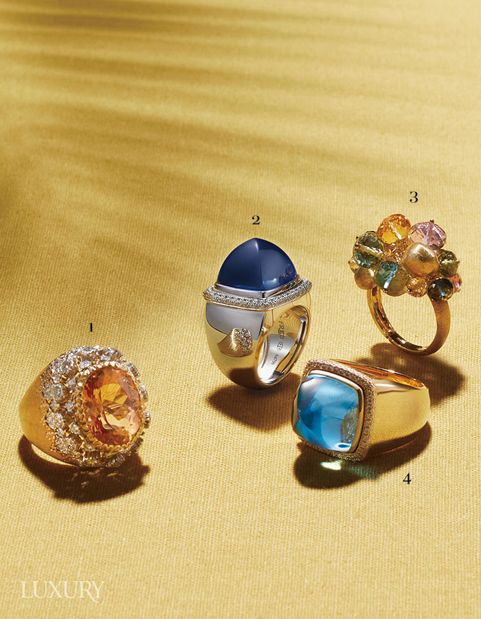 1 1920년대 미국의 화려함과 낭만을 담은 ‘토파즈 칵테일’ 링. 중앙의 패시드 토파즈를 감싸듯 화이트 다이아몬드를 층층이 세팅했다. 부첼라티 6905-3490. 2 부드러운 곡선의 볼록한 스톤 실루엣이 특징