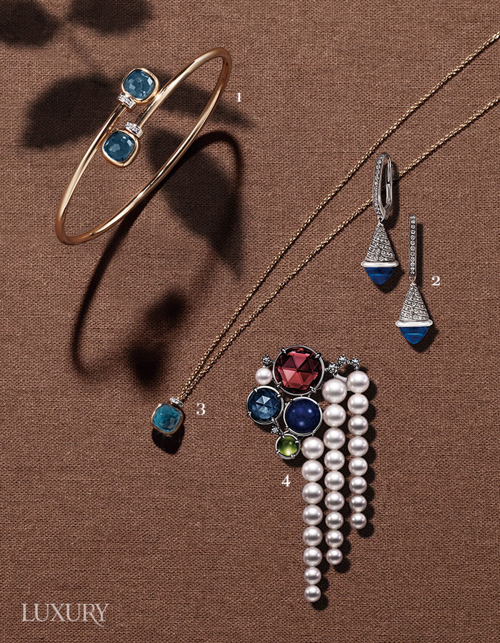 1 슬림한 옐로 골드 뱅글이 손목을 감싸는 ‘누도’ 브레이슬릿. 양 끝에 선명한 런던 블루 토파즈를 세팅해 고급스러움을 더했다. 포멜라토 0030-8321-0441. 2 이어링 상단부터 이어지는 화이트 다이아몬