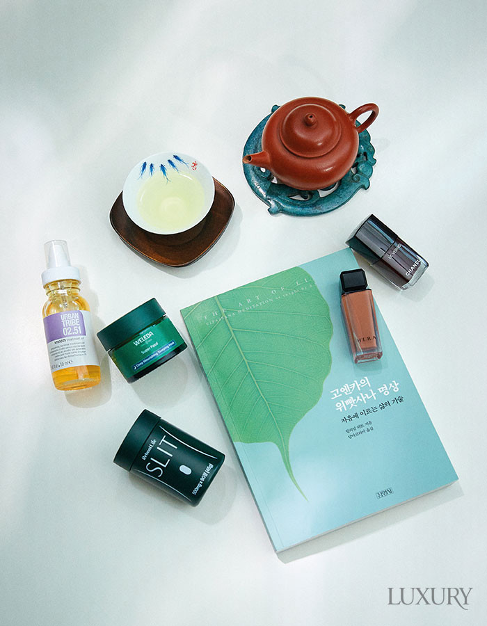 찻잔과 자사호 차를 마시면 비 내리고 피곤한 날, 몸을 따뜻하게 데워줘 편안해지고, 아침 일찍 일어난 날엔 뱃속이 뜨끈해지며 몸도 말랑말랑하게 풀린다. 어반트라이브 헤어 오일 모발이 건조해 꼭 바른다. 이제 몸에서 안 나오는 건 밖에서 채워야 하는 나이니까. 벨레다 수퍼 푸드 데이 크림 피부가 워낙 건조한 편이다. 이 크림은 유·수분 밸런스가 좋고, 향도 좋을뿐더러 인공적이지 않은 원료를 사용해 믿음이 가서 좋다. 자연에서 추출한 허브 향이 마음까지 편안하게 해준다. 리부트 슬릿 매일 아침 먹는다. 장 건강에도 좋고, 내장 지방을 제거해준다니 심리적 위안도 된다. 책 <고엔카의 위빳사나 명상> 요즘 명상에도 관심 있는 것을 아는 지인이 추천해 읽고 있다. 샤넬 르 베르니 기분 전환에 최고다. 발림이 정말 좋고, 빨리 말라서 초심자도 바르기 편하다. 헤라 센슈얼 누드 글로스 462 좋아하는 색상으로 몇 년째 재구매해서 사용하고 있다.