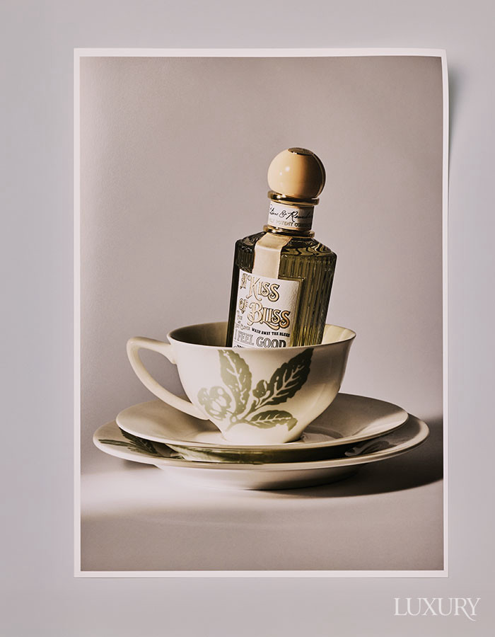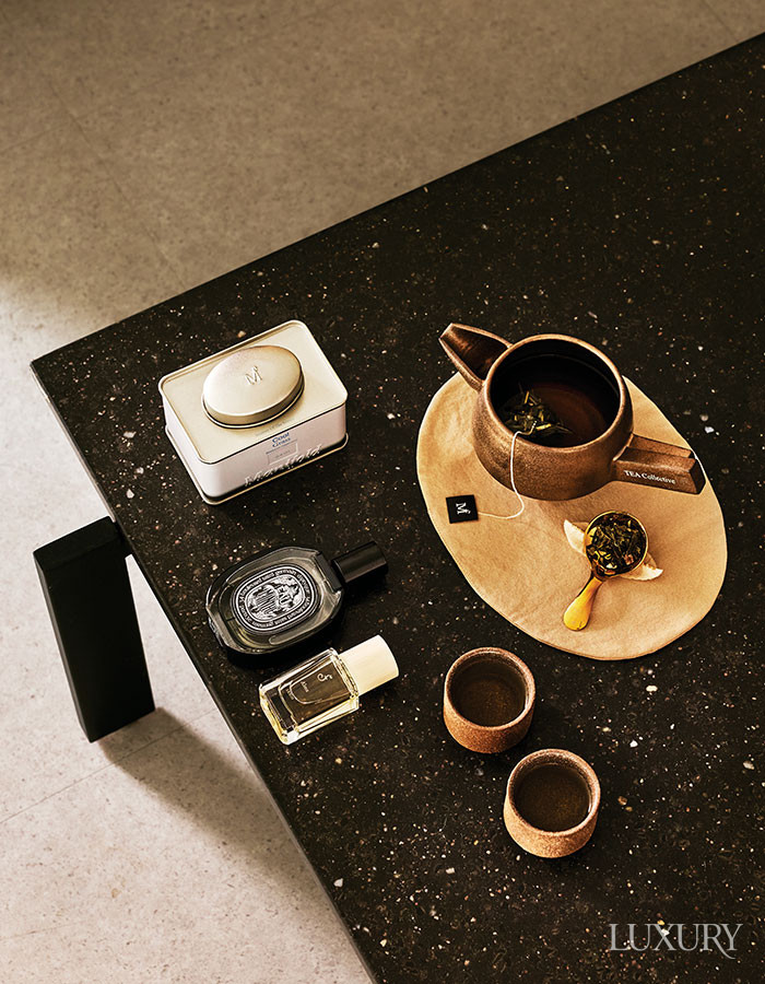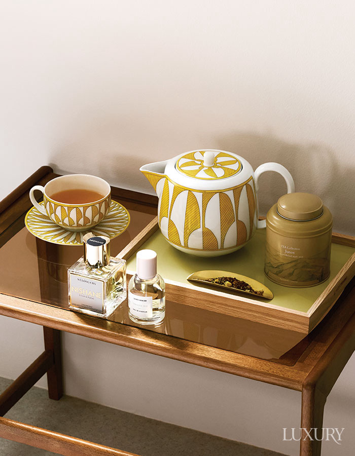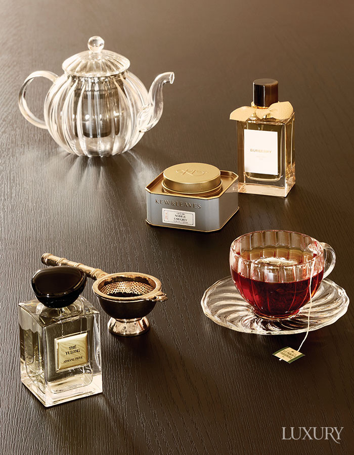 영국의 애프터눈 티에서 영감을 받아 베르가모트와 블랙 티를 블렌드한 향수 ‘버버리 시그니처 컬렉션 하이티’ 100ml는 버버리 뷰티. 중국 울롱산의 스모키한 블랙 티의 우아함을 담은 향수 ‘아르마니 프리베 레 조 컬렉션 테 울롱’ 100ml는 아르마니 뷰티. 뛰어난 내구성, 내열성, 선명도가 특징인 ‘엘레강스’ 글라스 티포트, ‘엘레강스’ 티 컵 & 소서, 대나무 모양의 손잡이가 포인트인 은도금 티 스트레이너 모두 포트넘 앤 메이슨. 베르가모트에 피치 향을 가미한 제주 홍차 ‘노들 얼그레이’는 큐앤리브즈.