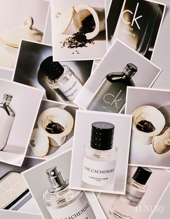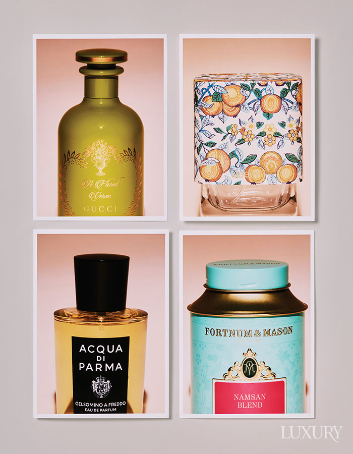 왼쪽 상단부터 시계방향으로 인도 재스민 삼박과 스리랑카 홍차를 매혹적으로 조합한 ‘플로럴 벌스’ 100ml는 구찌 뷰티. 영국 전통 차 문화에서 영감을 받아 시트러스 얼그레이 티의 향조를 완성한 ‘리버티 메이즈 EDP’ 100ml는 LBTY. 세컨드 플러시 다르질링에 장미꽃을 블렌딩한 홍차 ‘남산 블렌드’는 포트넘 앤 메이슨. 섬세한 재스민과 스모키한 블랙 티가 어우러지는 ‘젤소미노 아 프레도 오 드 퍼퓸’ 100ml는 아쿠아 디 파르마.