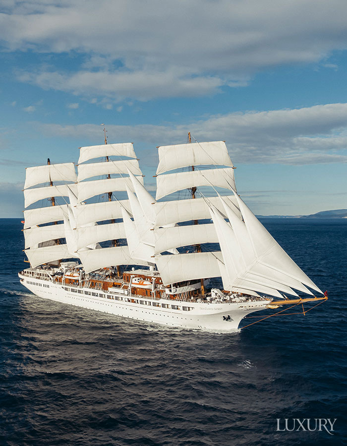 이탈리아 나폴리의 항구는 아침부터 빛이 강했다. 돌바닥은 뜨거웠고, 부두에는 염분을 머금은 공기가 낮게 깔려 있었다. 그리고 그곳에는 거대한 배가 정박해 있었다. 이름은 ‘시클라우드 스피릿호Sea Cloud Spirit’, 문학적으로 번역하면 ‘바다의 구름처럼 자유로운 영혼’이 되겠다. 길이 138m, 폭 17.2m, 펼친 돛의 면적이 4000㎡인 배는 소음조차 내지 않았다. 선체를 감싼 목재 질감은 잔잔히 빛을 흡수했고, 90명에 달하는 선원들도 말이 없었다. 아마 출항을 앞둔 긴장감 때문이었겠지. 이윽고 출항을 알리는 뱃고동이 울리자 밧줄이 풀리는 소리, 파도와 덱의 모서리가 부딪혀 발생하는 파열음이 들려오면서 배는 항만을 벗어났다. 이내 선장 부코타 스토야노비치의 환영 인사와 함께 넷째 날 생트로페 근해에서 돛을 펼칠 거라는 안내가 이어졌다. 간략한 브리핑이 끝나자마자 샴페인 한 잔을 들고 시 클라우드 스피릿호를 거닐기 시작했다. 도시의 윤곽이 희미해지자 바다의 색이 바뀌었다. 출발 시점에 옅은 회색이던 해수면은 곧 청록으로 변했고, 햇빛이 기울자 바다는 또 다른 얼굴을 보여줬다. 갑판에서는 해풍이 일정한 간격으로 옷깃을 스쳤으며, 잔을 들 때마다 손끝에 닿는 유리의 차가움이 묘하게 마음을 가라앉혔다. 만찬을 즐기러 들어선 ‘리도 덱Lido Deck’의 레스토랑에는 잘 닦인 목재와 리넨에서 배어 나온 냄새, 지중해 산해진미가 빚어낸 향이 잔잔히 섞여 있었다. 덕분에 식탁에는 느긋한 온기가 펴졌다. 점심의 웅성거림이 가라앉자 오후는 길게 늘어졌다. 파도는 꾸준한 박자로 외판을 두드리고 있었다. 해가 낮아질수록 접시 표면의 반짝임도 천천히 사라졌다. 저녁 무렵에는 와인의 마지막 향이 바람에 실려 흩어졌다. 그렇게 가볍게 미동하는 배는 하루의 리듬을 매듭지었다.