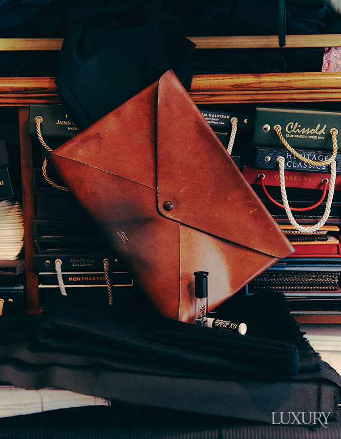 멋스럽게 태닝된, 구입한 지 10년이 넘은 일본 장인이 만든 가죽 클러치와 자신감을 더해주는 립밤, 마우스 스프레이.