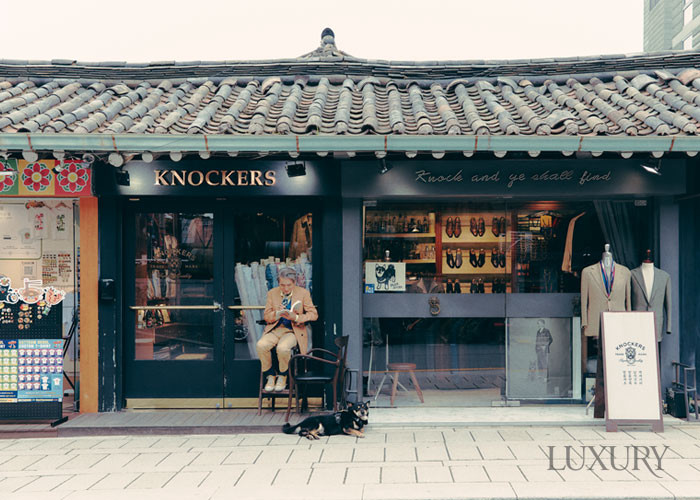 북촌에 위치한 노커스의 고풍스러운 외관. 그리고 멋쟁이 이사님과 숍의 마스코트인 귀여운 시바 견, 박시바. 전통적인 건축물과 영화 <킹스맨>을 연상케 하는 인테리어의 조화가 멋스럽다.