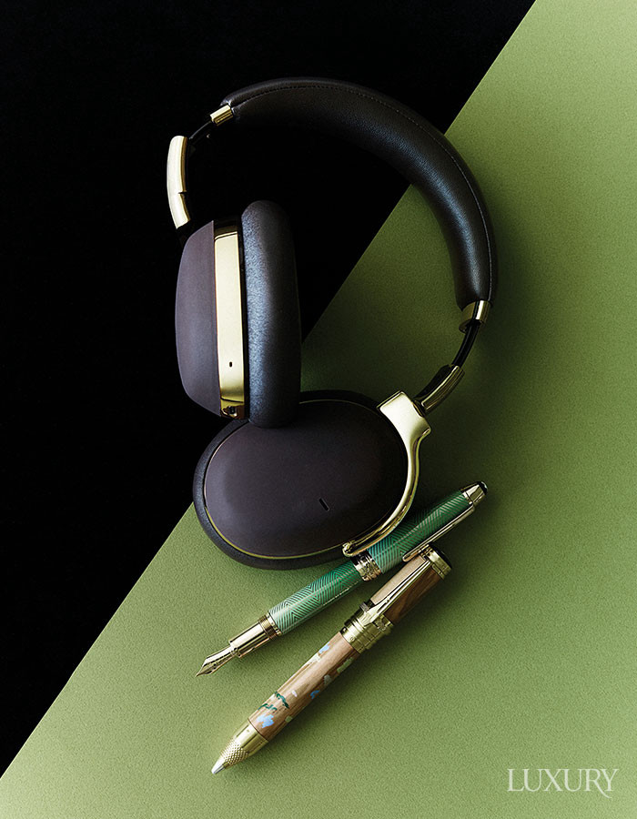 브라운 컬러 ‘오버 이어’ 헤드셋, ‘마이스터스튁 그레이트 마스터 캘리그래피 솔리테어 커브드닙’ 만년필, ‘마스터 오브 아트 오마주 투 피에르-오귀스트 르누아르 리미티드 에디션 4810’ 만년필 모두 몽블랑.