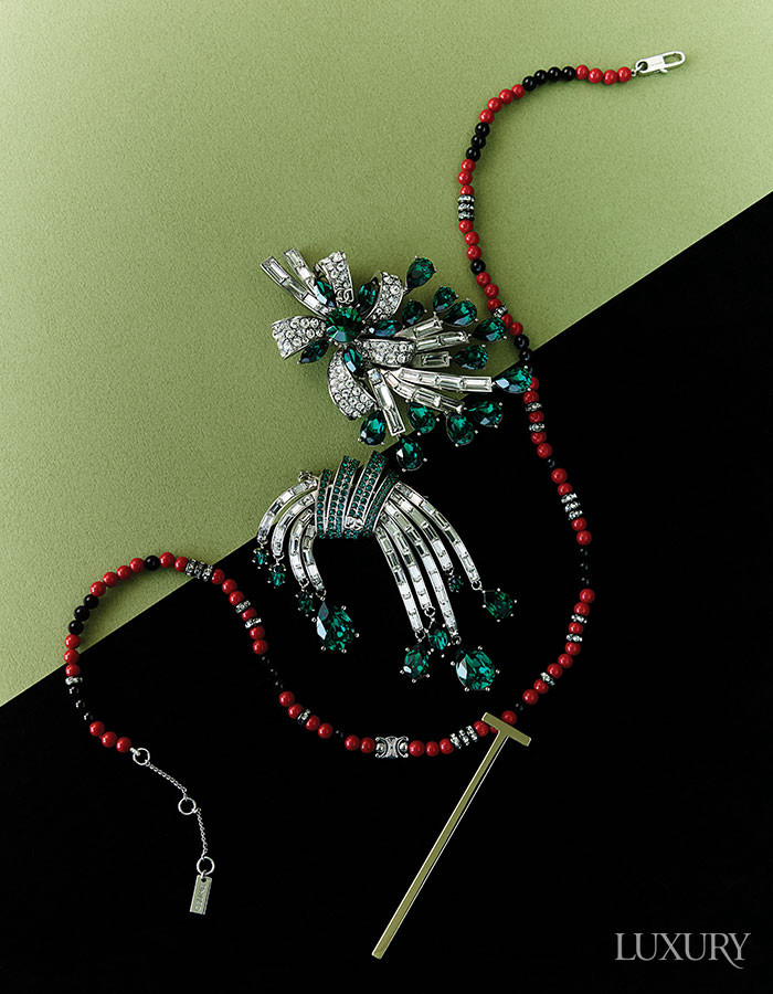 화이트 컬러와 그린 컬러 주얼이 어우러진 브로치 모두 돌체앤가바나. 트리옹프 모티프와 오닉스로 완성한 목걸이는 셀린느. T 모티프 브로치는 톰 포드.