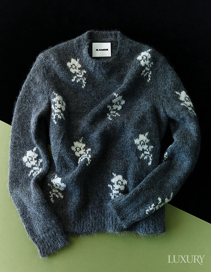 플라워 모티프 장식의 그레이 니트 톱은 질 샌더.