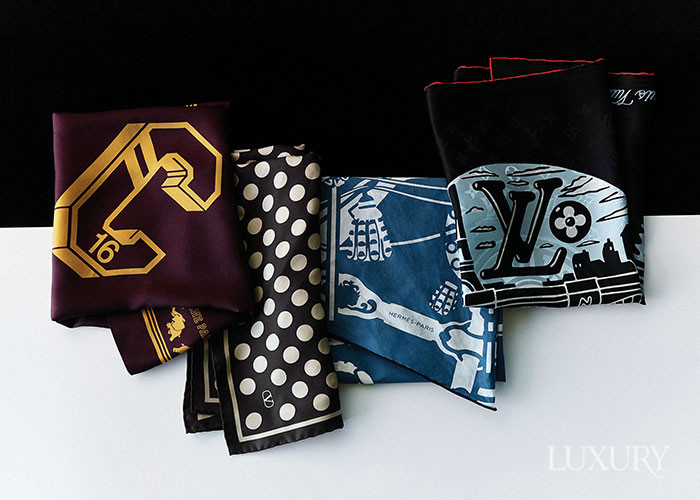 풋볼 플래그 프린트 실크 스카프는 셀린느. 화이트 도트 스카프는 발렌티노 가라바니. 청명한 블루 컬러가 매력적인 코튼 로장주 스카프는 에르메스. 파리 퐁 뇌프 다리와 에펠탑, 센강이 프린트된 실크 스카프는 루이 비통.