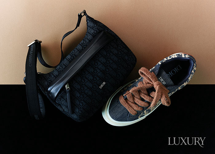 블랙 컬러 디올 오블리크 자카르 호보백과 두툼한 모헤어 슈 레이스가 특징인 데님 소재 스니커즈 모두 디올 맨.
