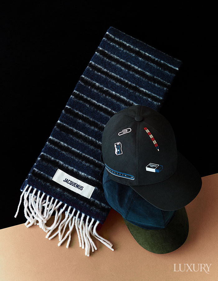 스트라이프 패턴 니트 머플러는 자크뮈스. 자수로 포인트를 준 모자와 벨벳 소재의 모자 모두 에르메스.