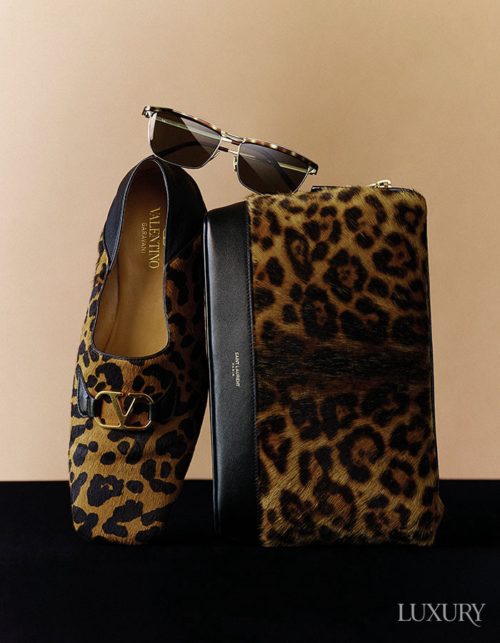 레오퍼드 패턴 프레임의 선글라스와 포니 헤어 가죽 소재 미니 파우치 모두 생 로랑 by 안토니 바카렐로. 로고 시그너처 디테일로 포인트를 준 로퍼는 발렌티노 가라바니.