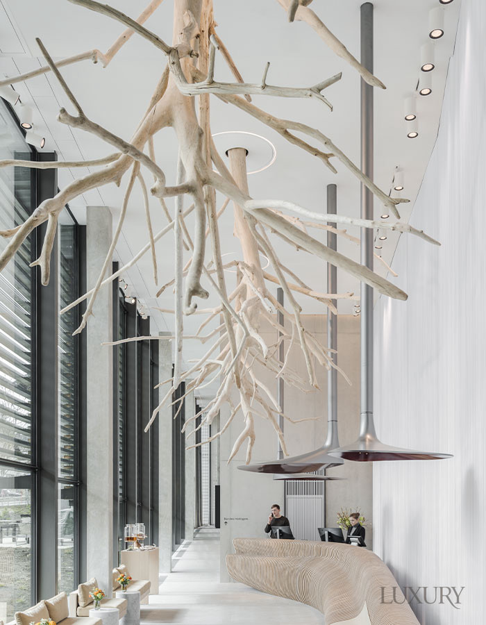 로비 천장의 거대한 나무뿌리는 호텔 데 오를로제의 정체성이자 발레 드 주 지역을 상징한다.