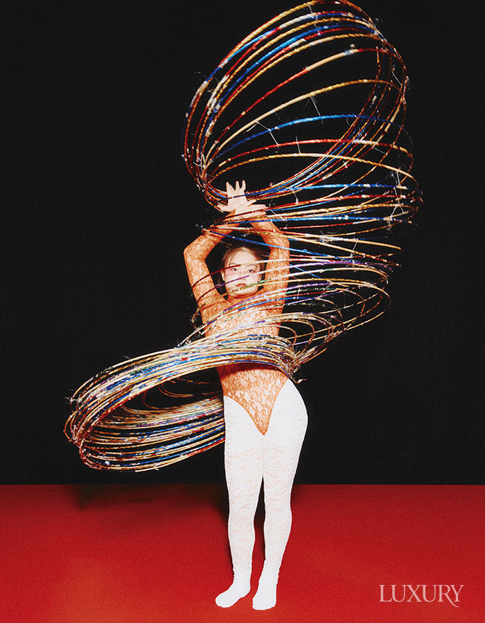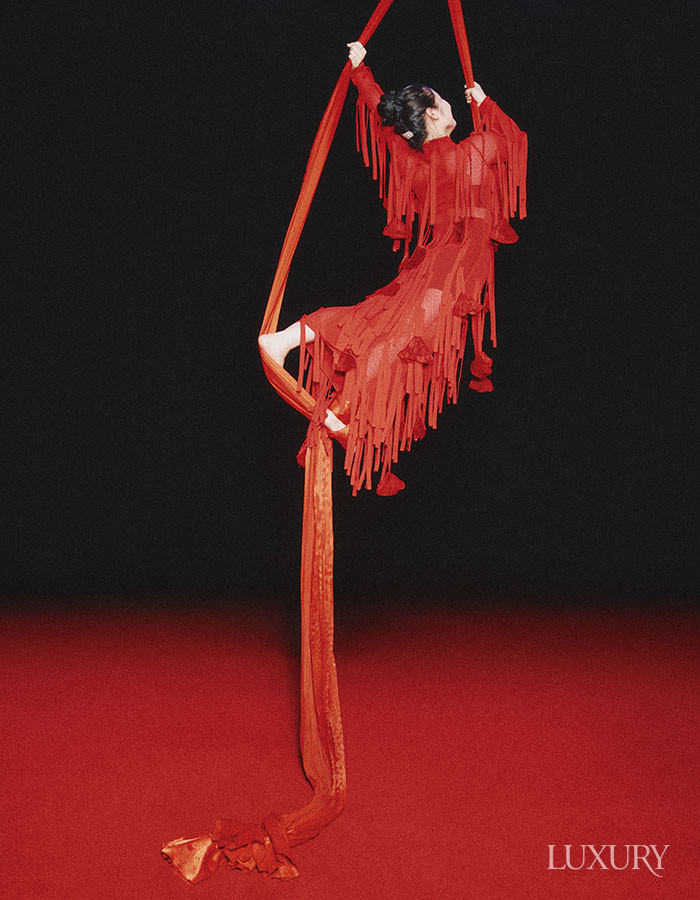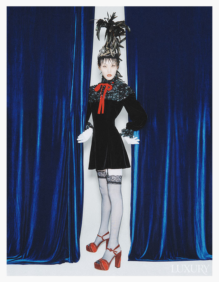 레드 리본 포인트의 미니 벨벳 원피스는 루이 비통. 깃털 장식의 헤드피스는 벨앤누보. 플랫폼 샌들은 지안비토 로시.