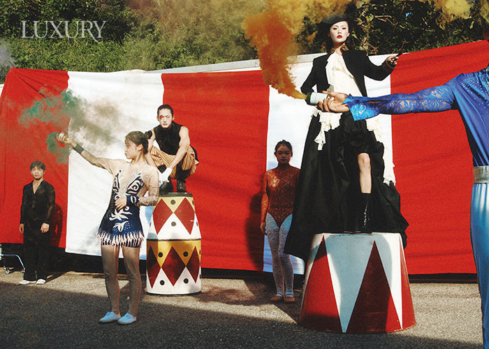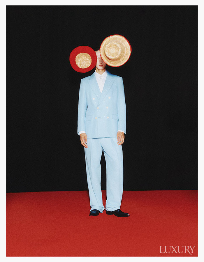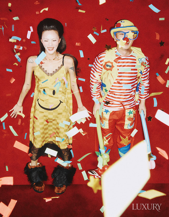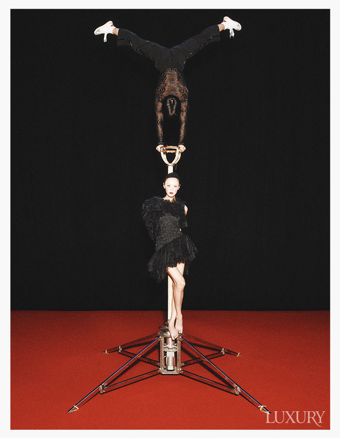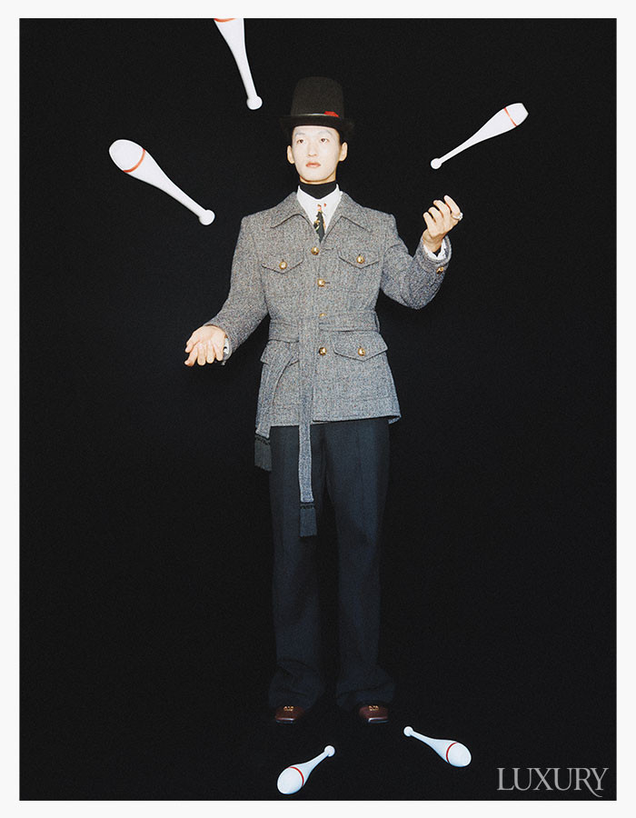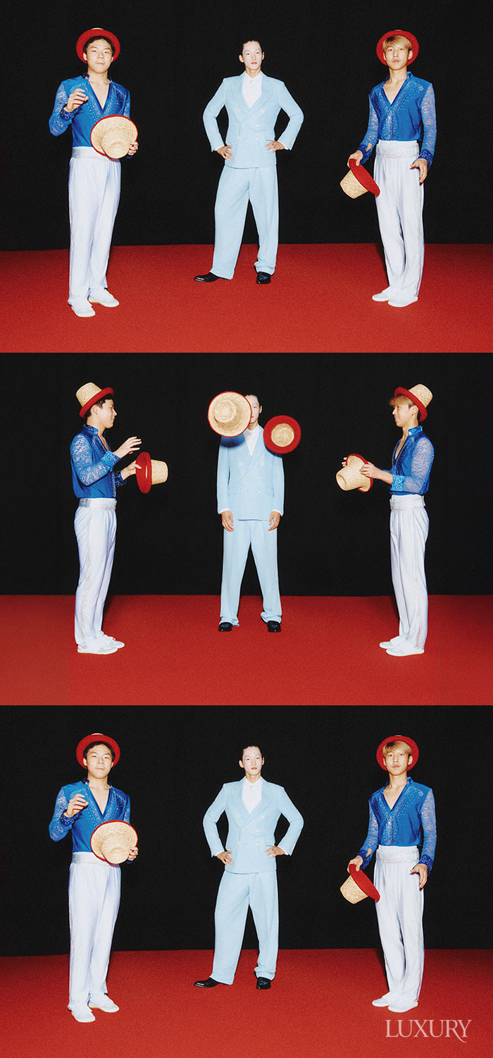 (승찬) 베스트는 로로피아나. 스트라이프 팬츠와 레더 부츠는 프라다. (루루) 블랙 엠브로이더리 재킷과 러플 디테일 화이트 블라우스, 레이스업 부츠 모두 맥퀸. 블랙 드레스는 핑크공. 헤드피스는 유니초이.