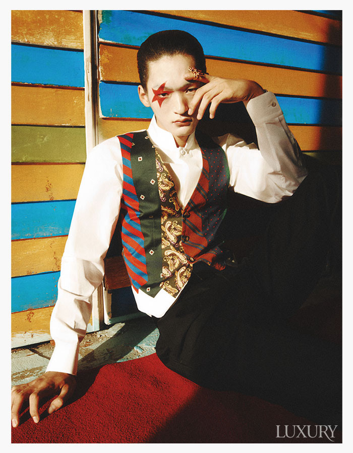 넥타이를 프린트한 트롱프뢰유 베스트는 모스키노. 화이트 셔츠와 팬츠는 로로피아나. 골드 링은 토코키노.
