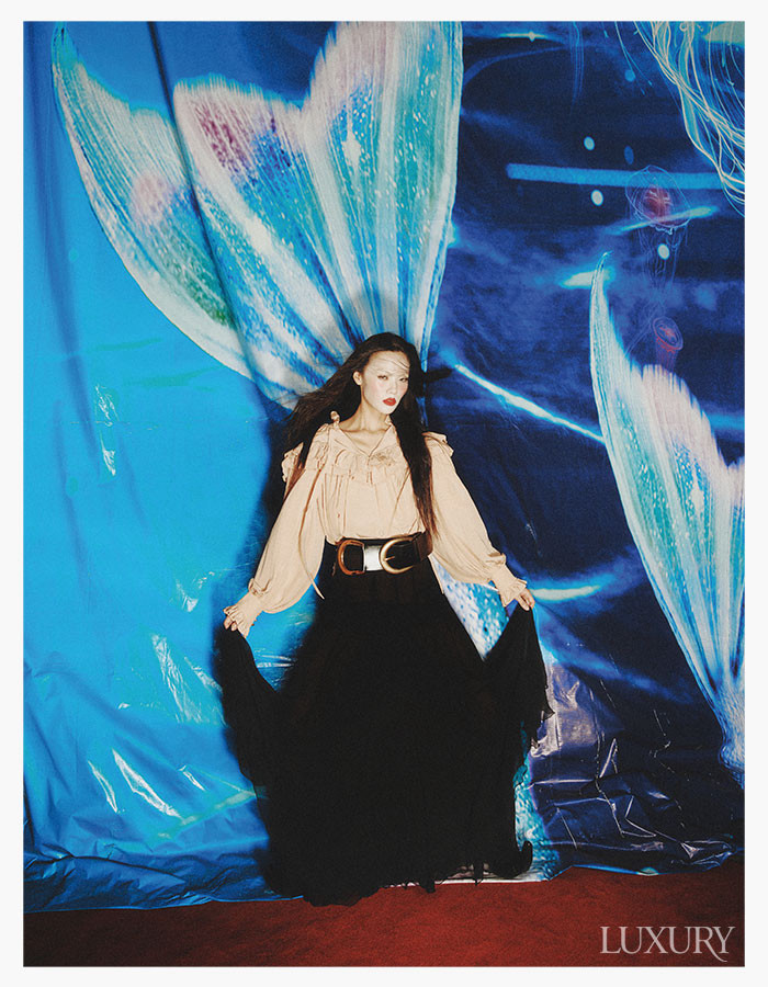 오버사이즈 러플 블라우스와 플루이드 맥시스커트, 빅 버클 벨트 모두 끌로에. 레이스업 부츠는 규리킴.