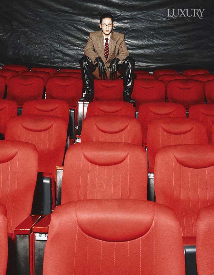 프린스 오브 웨일스 체크 재킷과 팬츠, 스트라이프 셔츠, 실크 타이, 레더 글러브, 니하이 부츠 모두 생 로랑 by 안토니 바카렐로. 안경은 발렌시아가 by 케어링 아이웨어.