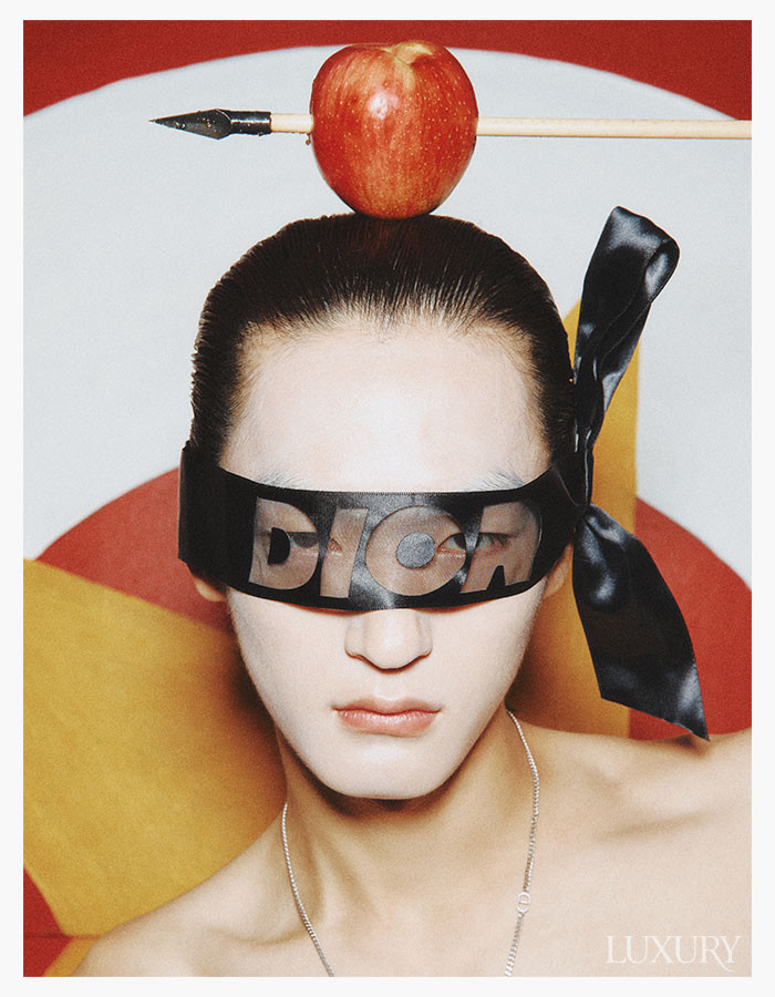 로고를 새긴 새틴 소재의 마스크와 실버 네크리스 모두 디올 맨.