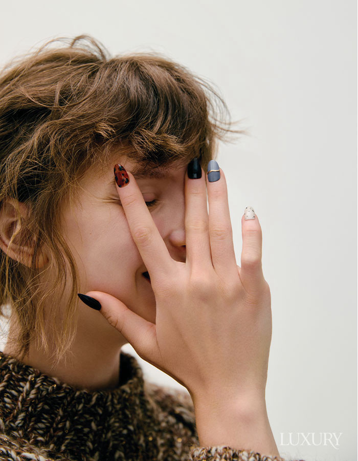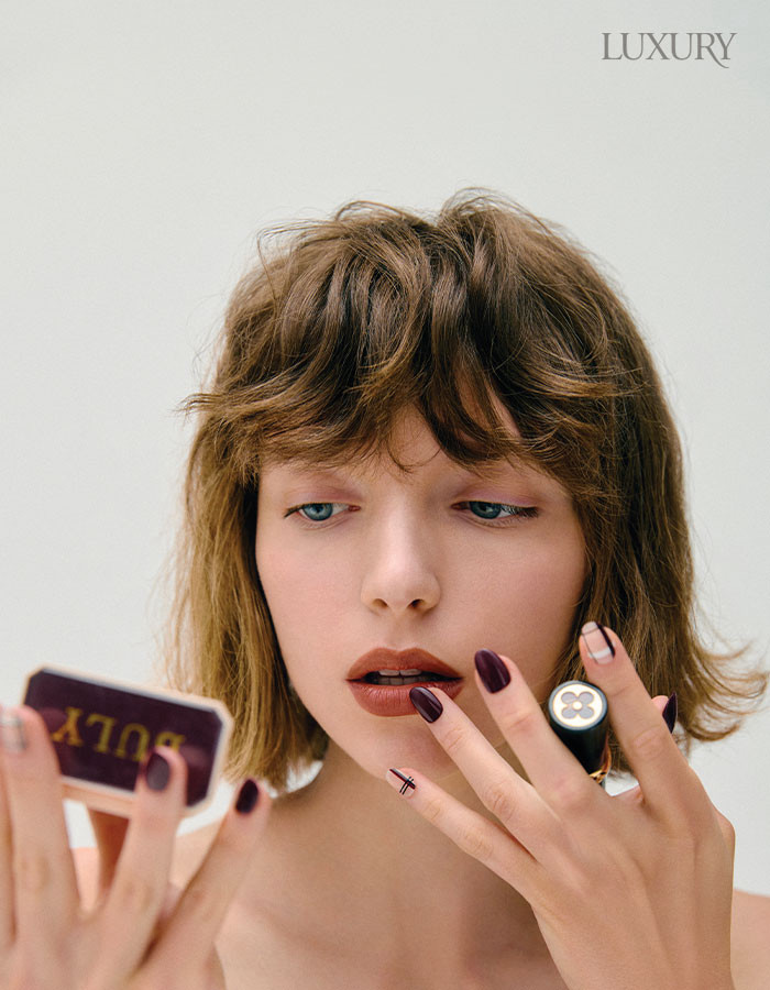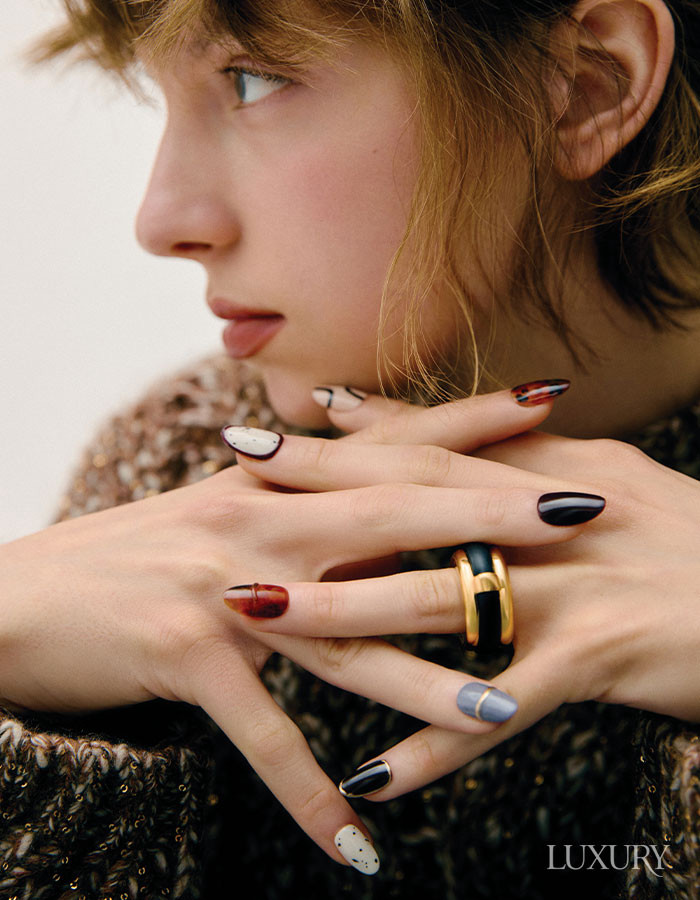 겨울의 무드에는 화려한 장식보다 절제된 패턴이 더 빛을 발한다. 그 은은한 멋을 가장 세련되게 보여주는 것이 바로 클래식 타탄체크다. 딥 플럼과 버건디 톤으로 손끝에 차분함을 더하고, 투명한 바탕 위에 화이트, 블랙, 레드 라인이 교차하는 타탄 체크 패턴을 변주해 포인트를 주었다. 은은하게 드러나는 체크 패턴은 단정하면서도 세련된 인상을 남기며, 니트나 울 코트와 자연스럽게 어우러진다. 라인의 간격과 방향을 달리한 디테일이 자칫 단조로울 수 있는 룩에 자유로운 리듬을 불어넣는다.