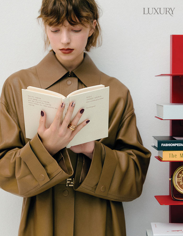 벨티드 레더 코트는 펜디. 레이어드한 ‘비제로원’ 링은 모두 불가리. 레드 컬러 책 선반에 진열되어 있는 ‘브레넌 클락’은 랄프 로렌.