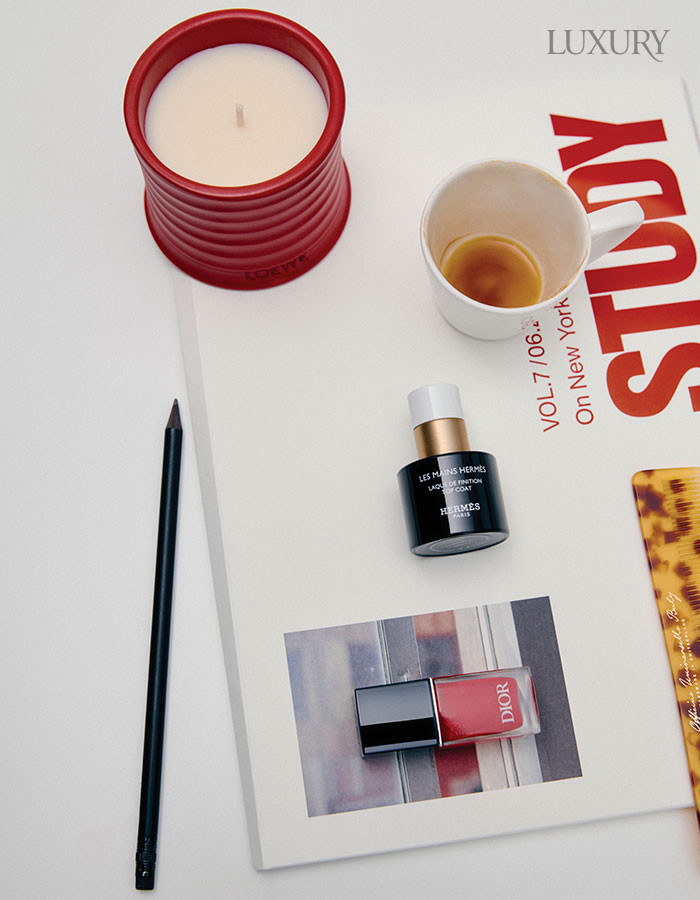 햇빛에 건강하게 자란 신선한 토마토잎의 향을 담은 캔들 ‘센티드 캔들 토마토 리프 S’. 토마토 자체에서 추출한 본연의 색상을 입혔다. 로에베 퍼퓸. ‘탑 코트’는 매끄럽고 윤기 있는 손톱으로 가꿔주는 마지막 터치. 투명한 젤 래커 텍스처가 손톱 표면에 반사되어 볼륨감 있는 곡선을 연출한다. 에르메스 뷰티. 선명하고 강렬한 레드 컬러가 인상적인 네일 래커 ‘디올 베르니 999 루즈’. 고급스러운 쿠튀르 컬러와 섬세한 디자인의 브러시가 특징이다. 디올 뷰티. 휴대가 간편한 미니 빗 ‘맨스 콤’은 넓은 간격의 빗살이 엉킴을 부드럽게 풀어주고 헝클어진 머리를 깔끔하게 빗어준다. 불리.