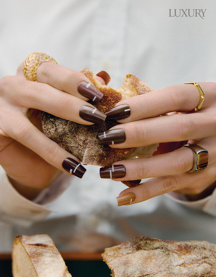 겨울 아침, 커피와 빵을 곁들이는 풍경에서 영감을 얻은 네일 아트. 짙은 에스프레소 브라운을 베이스로 올리고, 크림치즈처럼 농밀한 화이트 라인을 가늘게 그려 그리드 패턴을 완성했다. 굵기와 길이가 다른 선들이 만들어내는 패턴은 단정하면서도 모던한 무드를 선사한다. 한두 손가락에는 캐러멜 톤을 섞어 깊이감을 주었고, 자연광 아래에서 컬러와 질감이 더욱 풍부하게 드러나도록 연출했다.