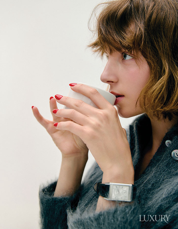 카디건과 크롭트 니트는 구찌. 과거와 현재를 우아하게 잇는 예거 르쿨트르의 아이코닉 워치, ‘리베르소 트리뷰트 스몰 세컨즈’. 피부처럼 부드럽게 손목에 감기며 빈티지한 무드가 인상적이다. 예거 르쿨트르.