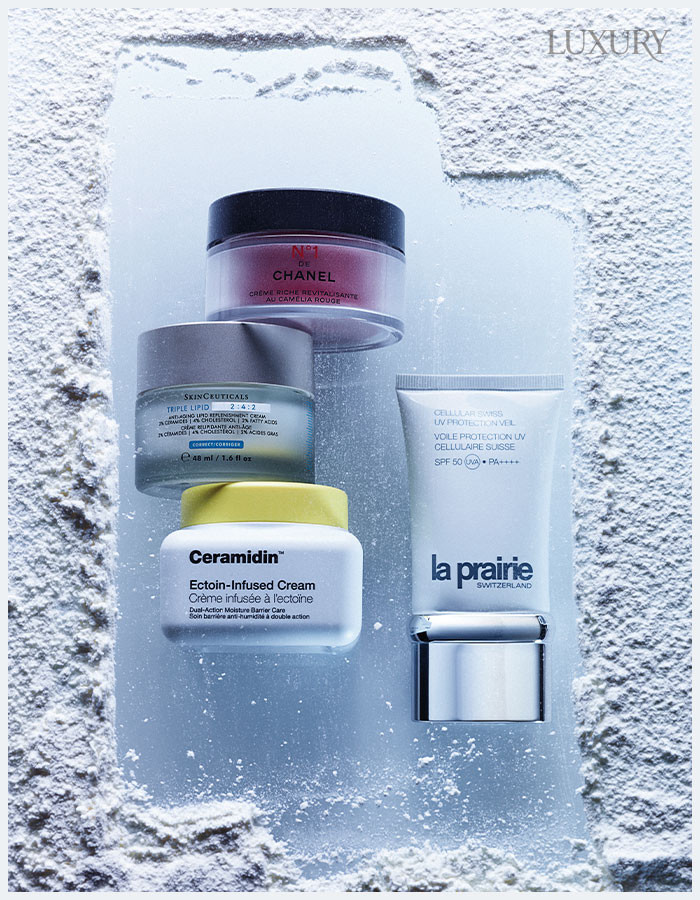 N°1 DE CHANEL 레드 까멜리아 리치 크림 레드 까멜리아 추출물과 오일, 까멜리아 세라마이드를 농축한 리치한 포뮬러가 외부 환경으로부터 피부를 보호한다. 샤넬. 트리플 리피드 2:4:2 피부 지질의 핵심 구성 성분인 세라마이드, 콜레스테롤, 지방산을 2:4:2라는 최적의 비율로 배합해 피부 장벽을 탄탄하게 강화한다. 스킨수티컬즈. 세라마이딘 엑토인 인퓨즈드 크림 세라마이드 복합체가 피부 장벽을 탄탄하게 세워주는 리치 포뮬러 크림. 닥터자르트. 쎌루라 스위스 UV 프로텍션 베일 노블 에델바이스 추출물이 피부를 건강하게 보호하는 자외선 차단제. 라프레리.