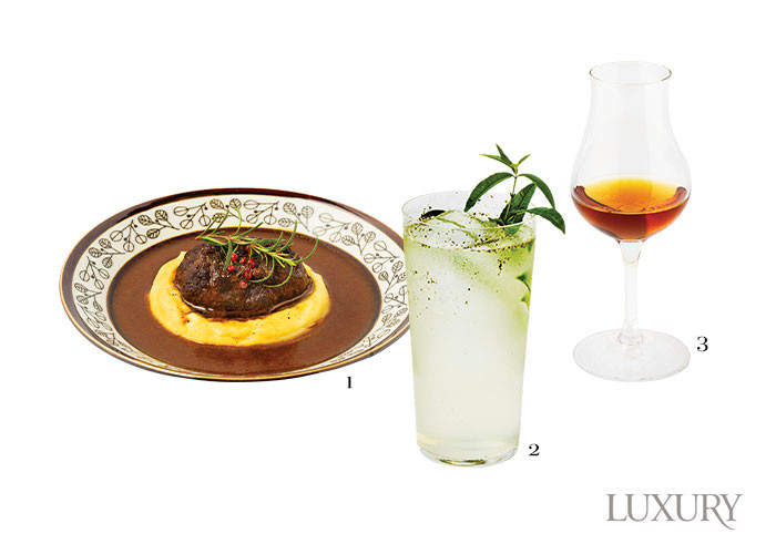 1 식감을 살린 쇠고기와 수제 그레이비소스를 함께 즐길 수 있는 ‘뵈프 부르기뇽’. 2 레몬 버베나의 향이 가득한 ‘시그너처 피즈’. 3 육류 요리와 잘 어울리는 위스키 ‘스프링뱅크 21년’.