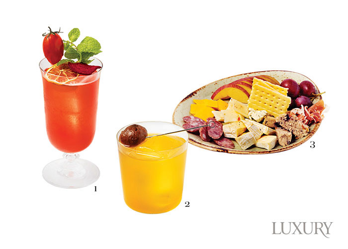 1 럼을 베이스로, 여러 과일을 더해 싱그러운 ‘A.B.C’. 2 밤과 팥, 홍차가 어우러져 차를 연상케 하는 ‘보름’. 3 풍성한 치즈와 샤퀴트리의 ‘치즈 플레이트’.