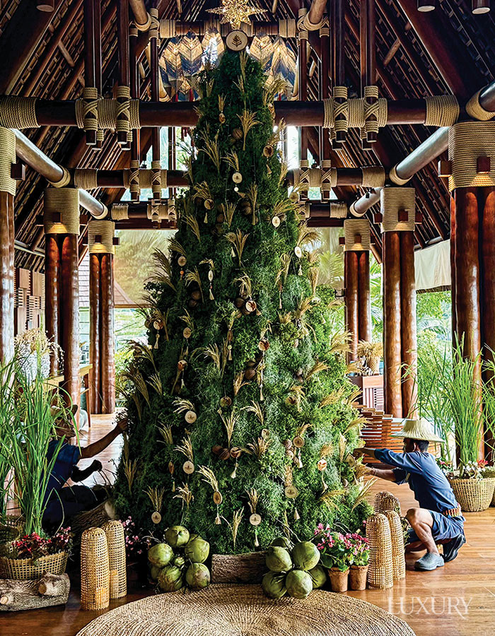 리조트 자체 농장에서 공수한 열대 식물과 천연 소재로만 제작해 지속 가능성 메시지를 전한 포시즌스 리조트 코 사무이.