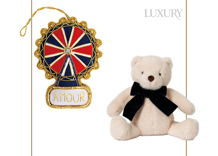 (왼쪽부터) 빨간 고깔모자와 망토로 특별함을 더한 ‘2025 해리 곰인형 스페셜 에디션’ 6만5천 원. 유니언 잭 위에 프랑스어로 ‘메리 크리스마스’를 뜻하는 문구를 새겨 넣은 패브릭 소재 데코 오너먼트 1만7천 원.