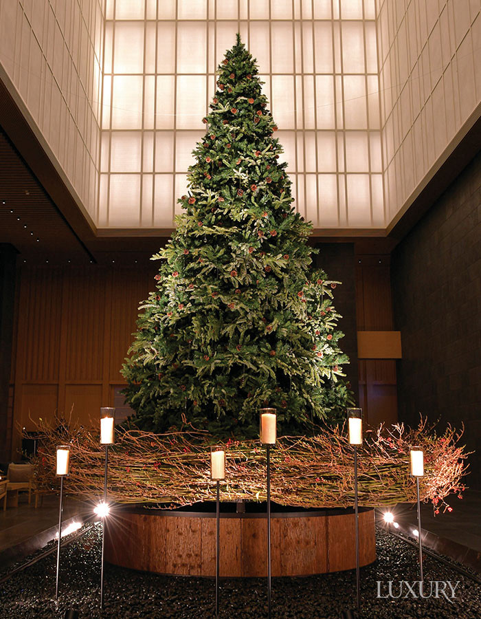 일본 전통건축 양식의 로비에 고요한 분위기를 더하는 5.3m 높이의 트리를 세운 아만 도쿄.