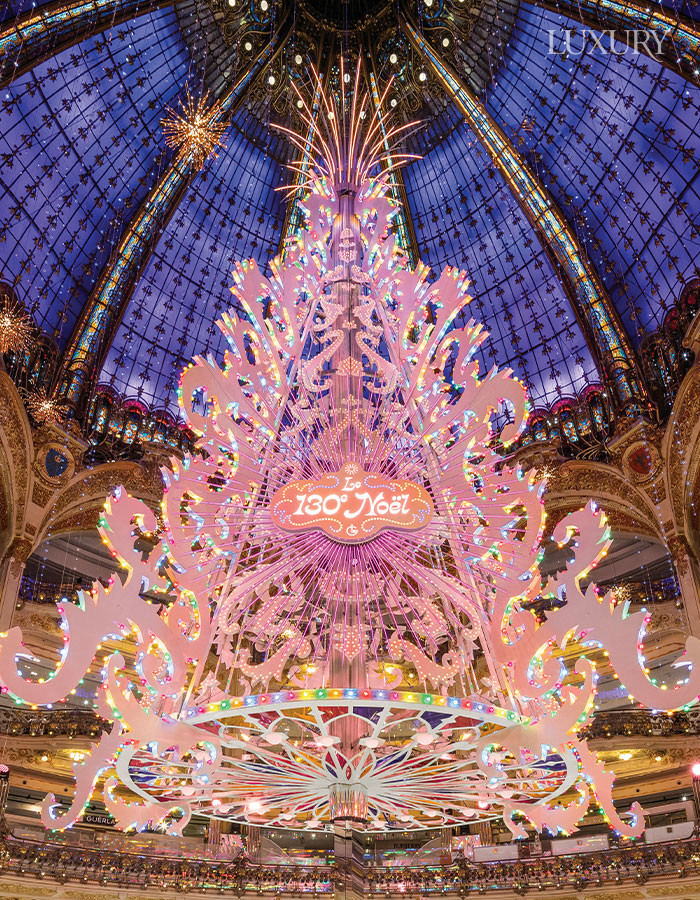 약 2만 개의 LED 조명으로 구성한 갤러리 라파예트의 트리. 꼭대기는 케빈 제르마니에Kevin Germanier의 드레스 디자인에서 영감받은 광섬유 불꽃 디테일로 장식해 마법 같은 분위기를 더했다.