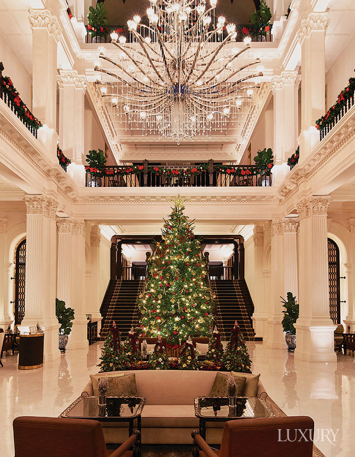 유서 깊은 건축미를 품은 헤리티지 호텔답게 백여 년의 시간이 켜켜이 담긴 콜로니얼풍 아치와 기둥 아래, 따뜻한 조명으로 빛나는 트리로 장식한 래플스 싱가포르.
