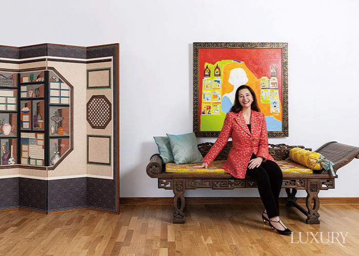 미셸 모프 안데르손 왼쪽에 자리한 책거리 작품은 이네즈 길Inez Gil 작가의 작품. 뒤편에 걸린 그림은 그녀가 애정하는 중국 작가 굴리스탄Gulistan의 작품이다.