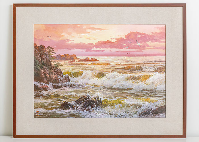 남북이 하나로 이어지는 지점을 상기하게 하는, 해금강을 연상시키는 그림. 그곳을 여러 차례 방문한 경험이 있는 그녀에게 이 작품은 바다와 하늘, 파도와 갈매기에는 경계가 없다는 사실을 일깨워준다.