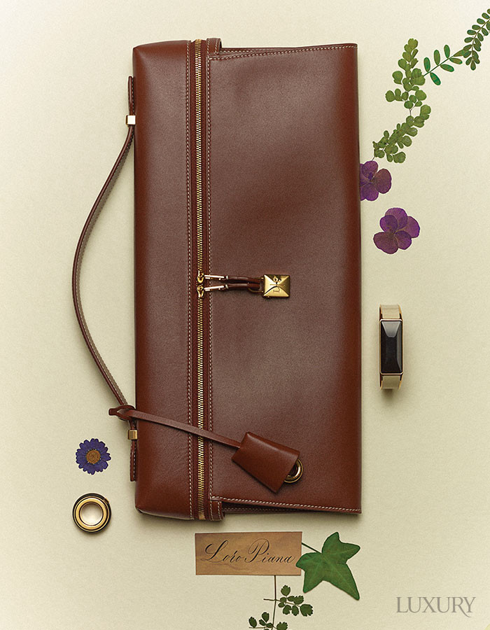 참 장식과 스냅 버튼 디테일의 클러치백, 새틴으로 감싼 오픈 커프 브레이슬릿, 골드 위에 블랙 카프스킨 가죽을 더한 스카프 링 모두 로로피아나.