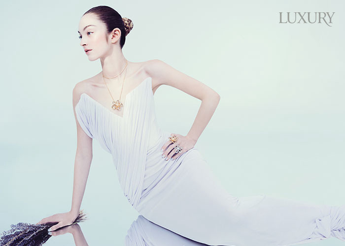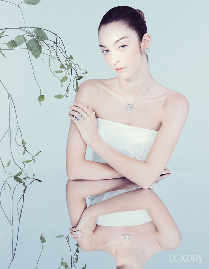화이트 골드에 다이아몬드를 세팅한 ‘플라워레이스’ 이어링과 펜던트, 링 모두 반클리프 아펠.