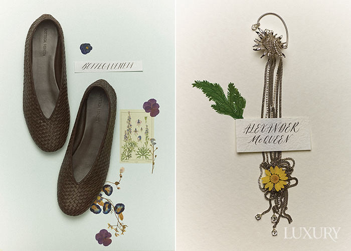 (왼쪽부터) 인트레치아토 발레리나 플랫 슈즈는 보테가 베네타. 선플라워 모티프와 크리스털 체인이 돋보이는 드롭 형태의 이어링은 맥퀸.